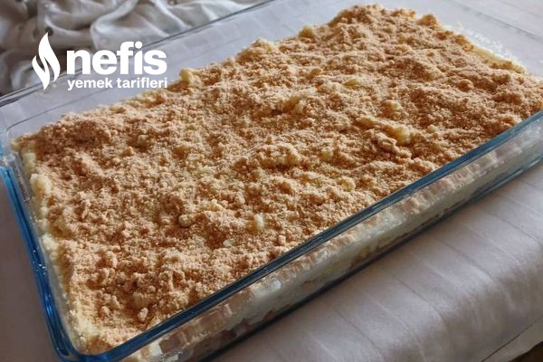 6. En üstünü de ezdiğimiz bisküvilerle kaplıyoruz, 1 saat buzdolabında bekletip sonra servis yapıyoruz.