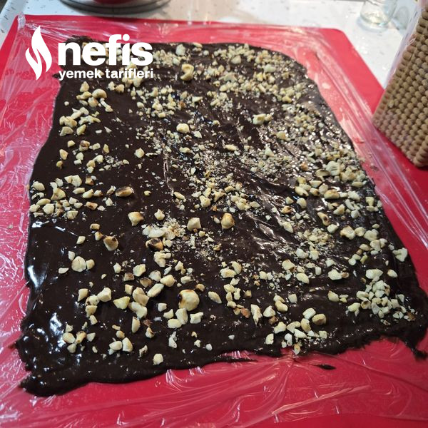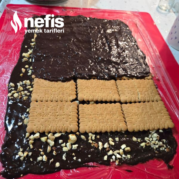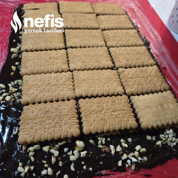 - Fındık kırıklarınıda serpiştirin ,bisküvileri suyla yada sütle tek taraflı ıslatıp 3 sıra eninde 6 sıra uzunluğunda olacak biçimde muhallebinin üzerine dizin.
