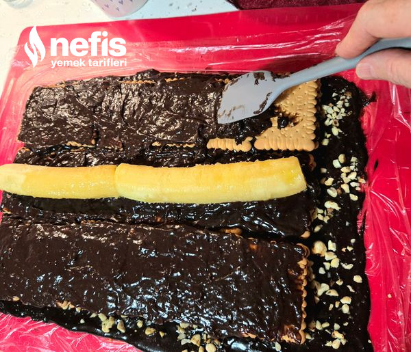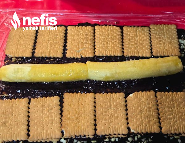 - İkinci katınıda birebir halde yapın yani 2 sıra bisküvi olacak 3 cü sırada ise orta kısım boş kalacak kenarlara yeniden bisküvileri dizin ,kalan sosu üzerine gezdirin orta boşluğa soyulmuş muzları bütün olarak yerleştirin.