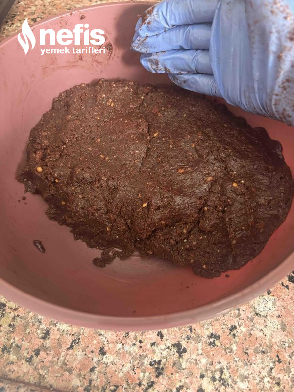 - Tüm sıvı eserler karıştıktan sonra karışımın üzerine ufaltışmış bisküvilerimizi ekliyoruz. Cevizi de bu adımda ek ederek yoğuruyoruz. Parlak ve karışmış bir hamur elde ediyoruz.