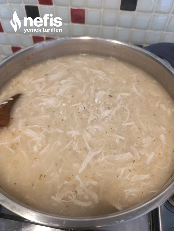 - Ardından tencereye sıcak suyu, tavuk suyunu, didiklemiş olduğumuz tavukları ve rendelediğimiz sarımsağı ekleyip kaynatıyoruz.
