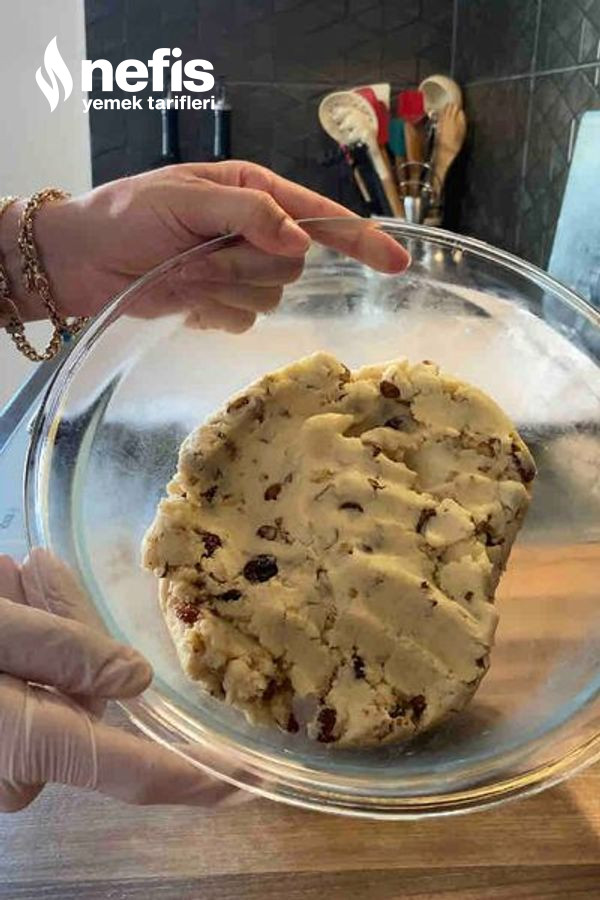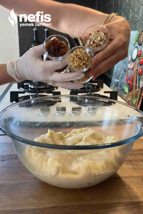 - Kıvam alan hamura başka gereçlerini; bıçakla doğranmış ceviz, badem, kuru üzümü ekleyip bir kere daha yoğuralım.