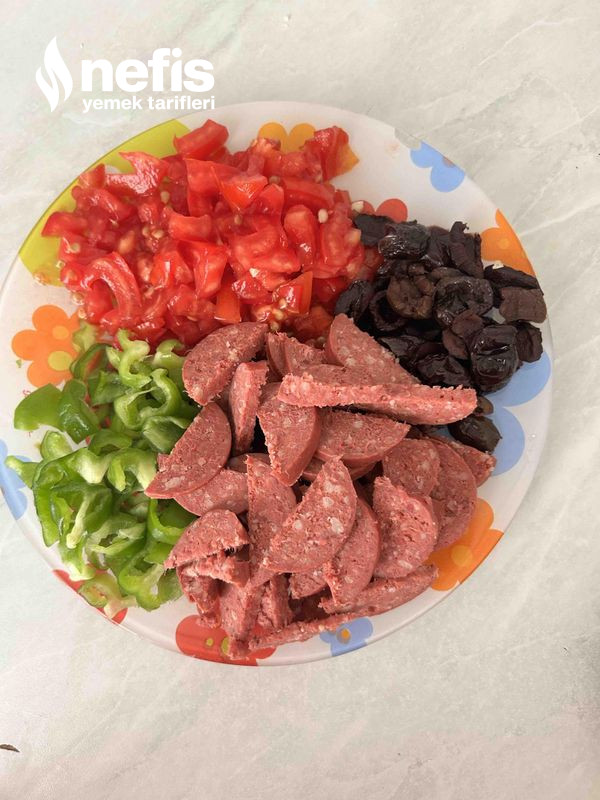 3. Hamur mayasını tutana kadar domates biber sucuk zeytinleri doğrayalım.