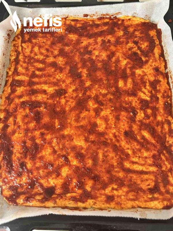6. Hamuru tepsiye elimizle yayabiliriz ( sosu döküp elimizle açarak yayınca hamuru daha lezzetli hale getirebiliriz ).