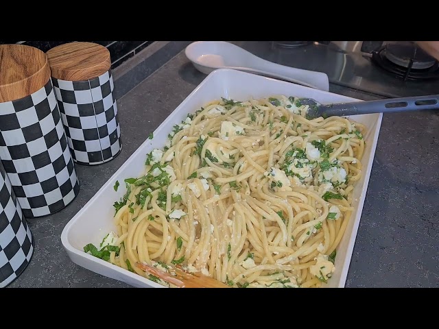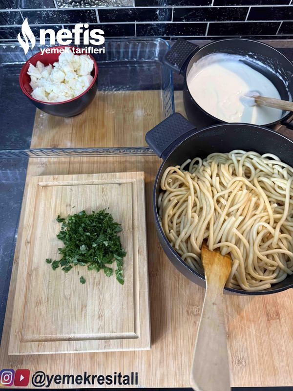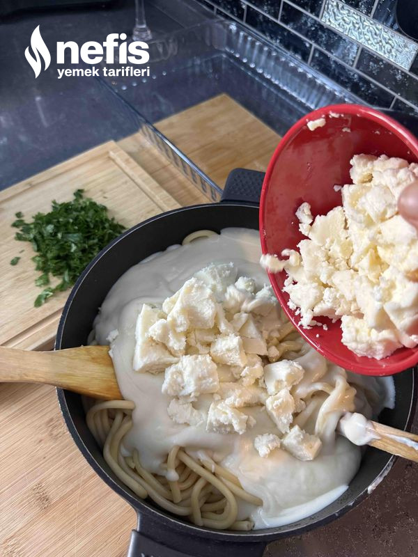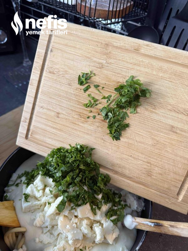 - Karıştırma kabına makarnayı bir kase peyniri bir kase kadar doğranmış maydanozu ekleyip karıştırın(ben birazda krem peynir ekledimmm tavsiye ederim)
