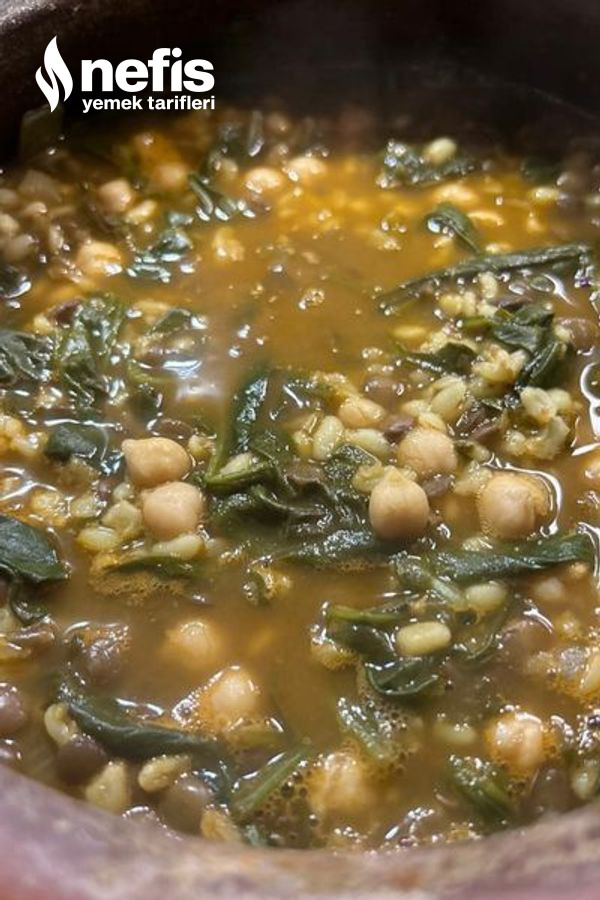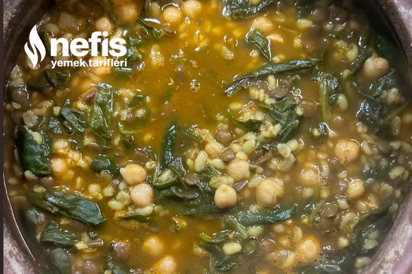 - Yıkanmış ıspanağı tencereye ekleyip karıştırın. Akabinde pişmiş yeşil mercimek, nohut ve yıkanmış bulguru ekleyin.