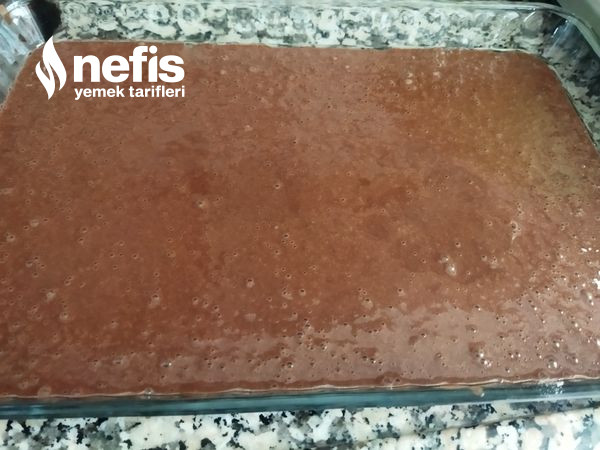 6. İlk sıcak gittikten sonra kek in üzerine çokça yaydırarak döküyoruz ve sıcağı geçtikten sonra buzdolapta ortalama 2- 3 saat dinlendirme yapiyoruz.