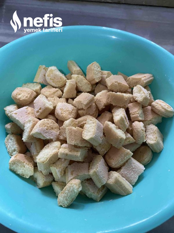 - Kedidili bisküvilerini 4 kesime bölelim muhallebinin içine döküp karıştıralım yuvarlak orta uzunluk borcama dökelim eşit ölçüde düzleştirelim.
