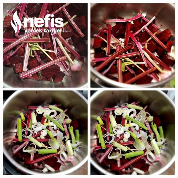 2. Pancarları derin bir kabın içinde tuz ile harmanlıyoruz. Soğanı yemeklik doğruyoruz. Düdüklünün içine sırasıyla doğranmış kuru soğan, pancar, pancar sapları, taze soğanları ekliyoruz.