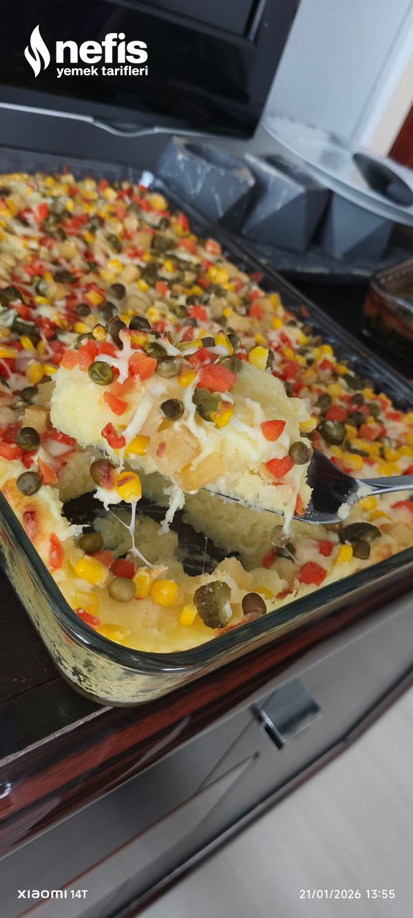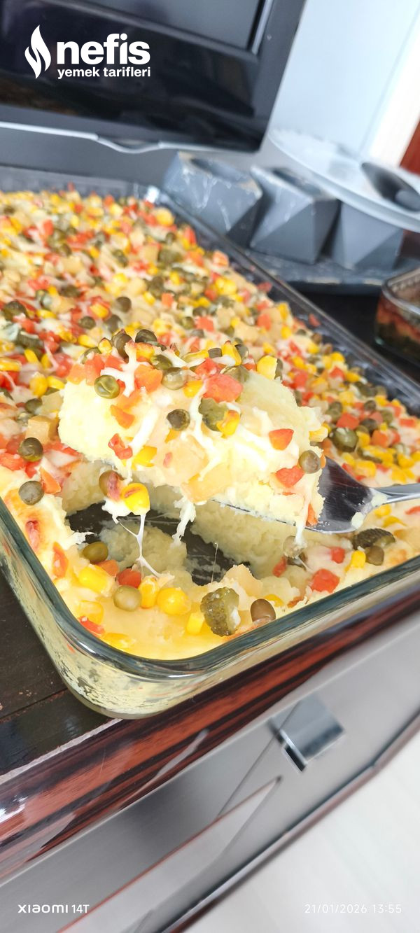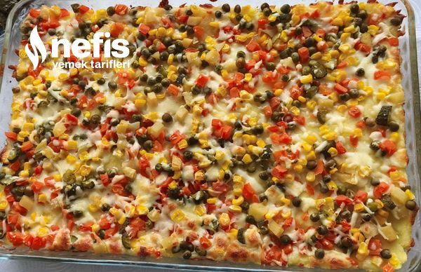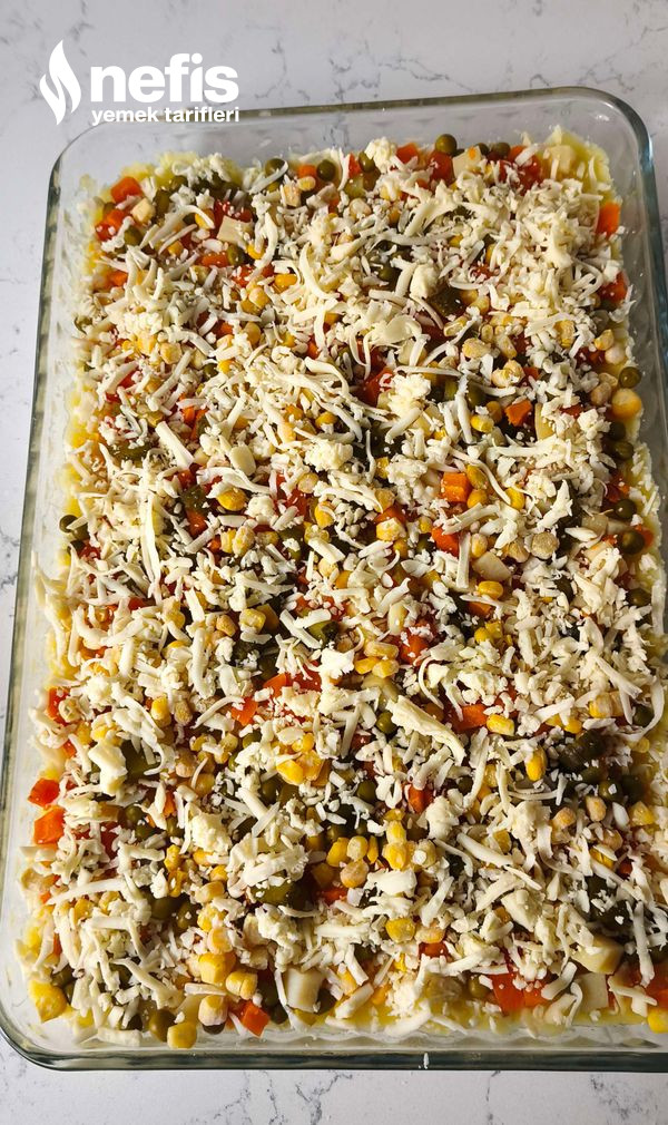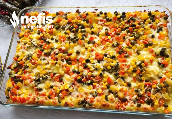 - Üzerine garnitür, mısır, kornişon turşu ekleyip en son yeniden üzerine kaşar rendesi ekliyoruz.