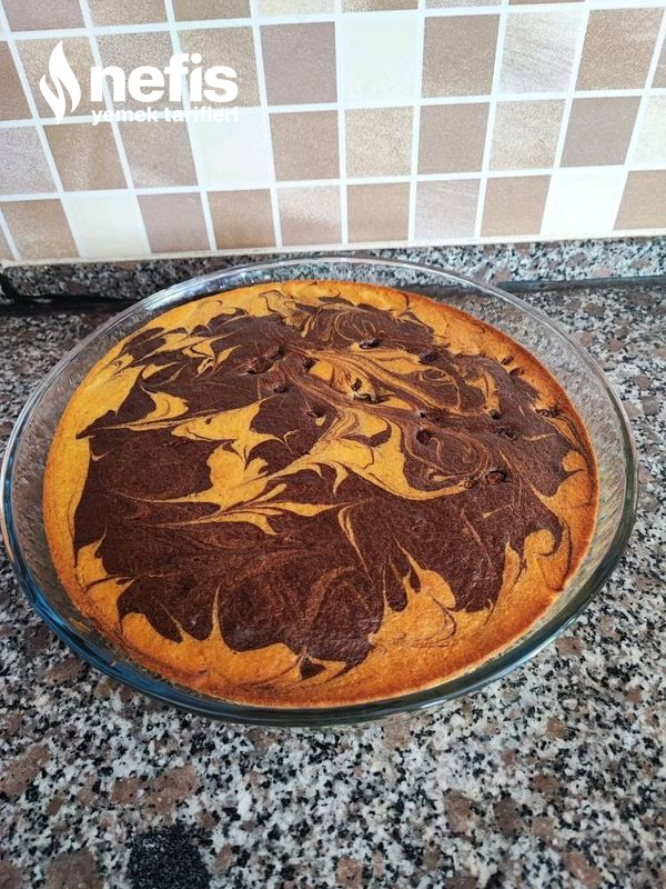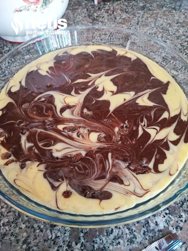 - Yağlanmış borcama birinci sade olanı güzelce dökün sonra kakaolu kısmı üstünde gezdirerek dökün. Kürdan ile üstünden geçin formlu olsun. Sonra ben bir kısmının üstüne kuru üzüm koydum sizde çikolata, üzüm koyabilirsiniz.