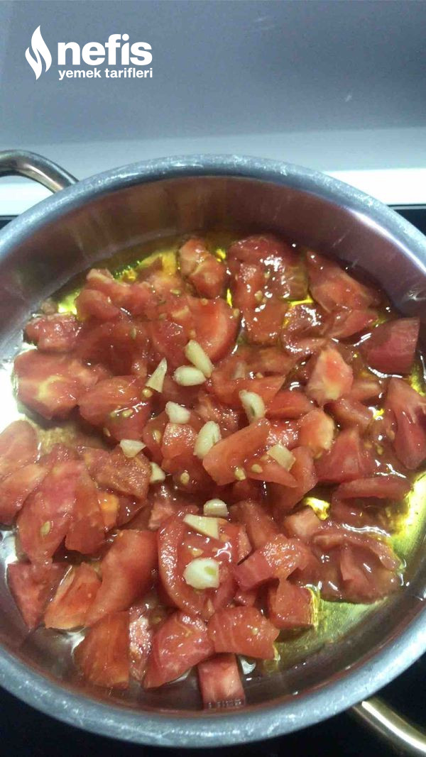- Tavaya zeytinyağını koyup üzerine kabuklarını soyduğum domatesleri ,sarımsağını ,koyup güzelce kavurdum.