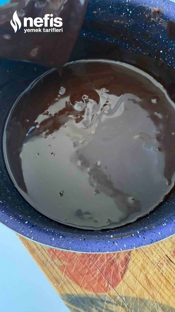 - Ganaj için; bir sos tenceresinde sütü ekleyip ısıtın, çikolata ekleyip eritin. Tereyağı ekleyin, eritin. Güzelce karıştırıp kekin üzerine dökün.