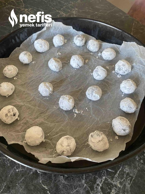 4. Dinlenen hamur biraz sertleşmiş olacak ele yapışmaz. Cevizden daha küçük formda modüller koparıp yuvarlayın ve pudra şekerine güzelce bulayın.