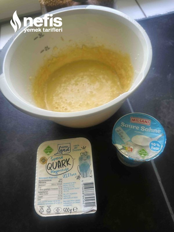 12. Quark, ekşi krema, nişasta ve limon suyunu ekleyip pürüzsüz olana kadar karıştırın. Çırptığınız kremayı spatula ile yavaşça karışıma ek edin.