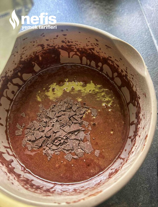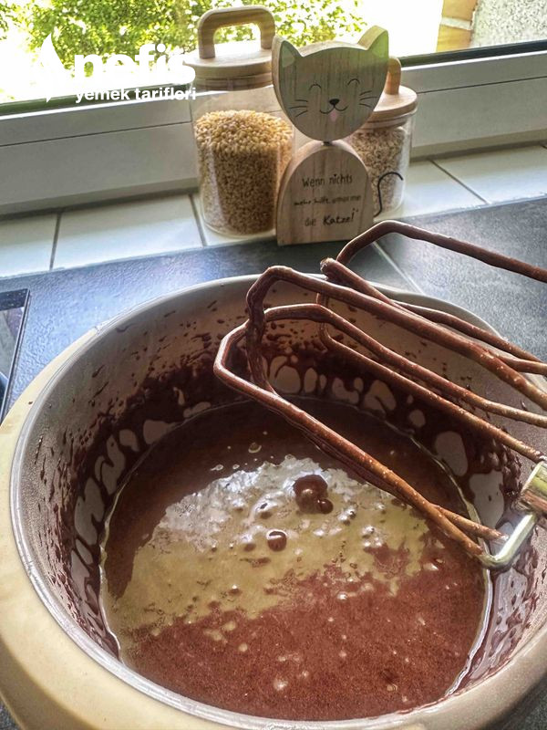 6. Ardından erimiş çikolatalı-tereyağlı karışımı içine yavaş yavaş ekleyin ve karıştırın.