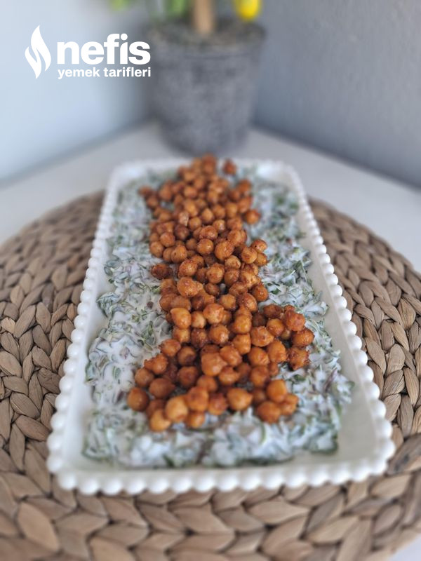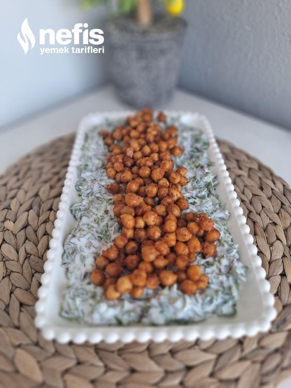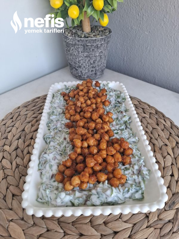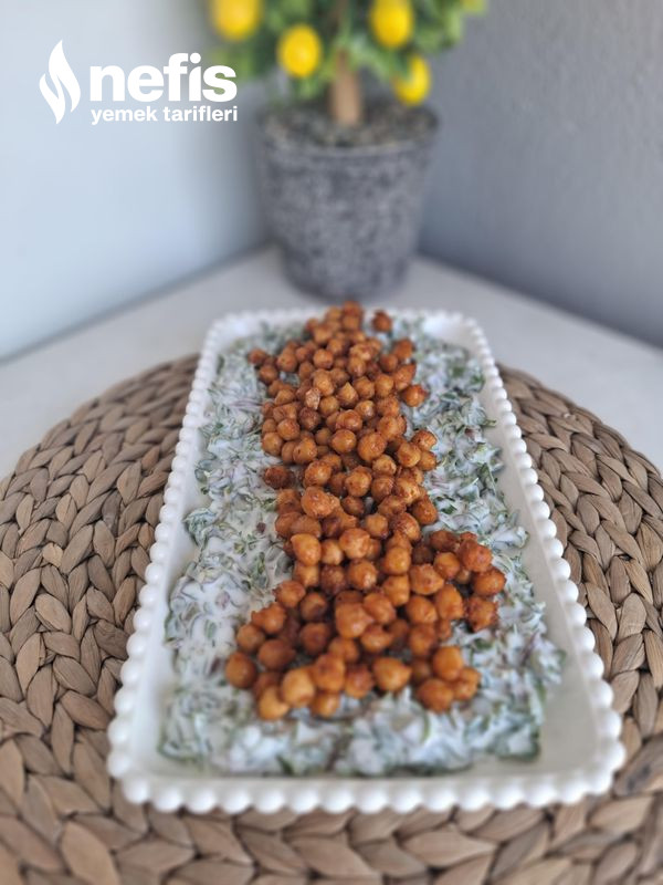 - Daha sonra semizotlarını doğrayın karıştırma kabına alın, üzerine çırpılmış yoğurt ekleyip, karıştırın. Servis tabağına alın, üzerine nohutları ekleyin. Afiyet olsun.