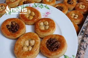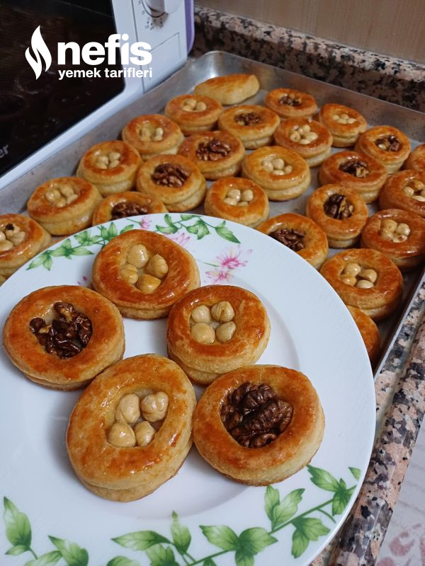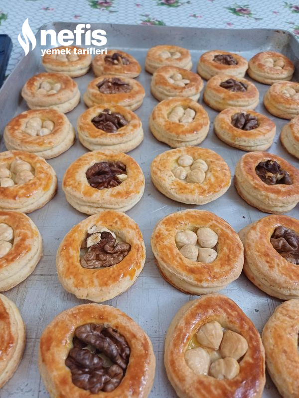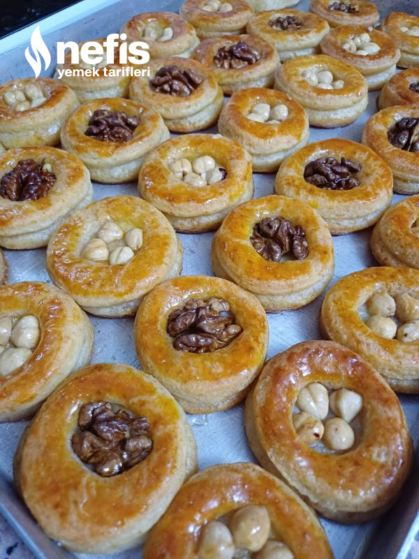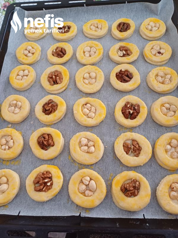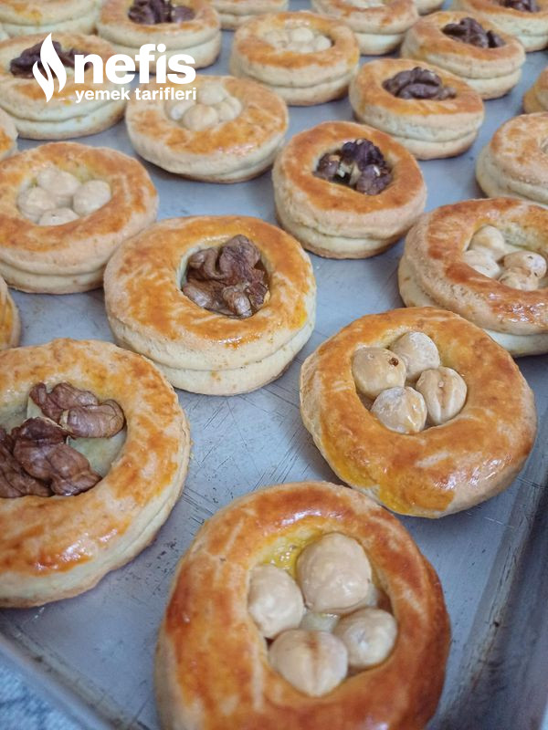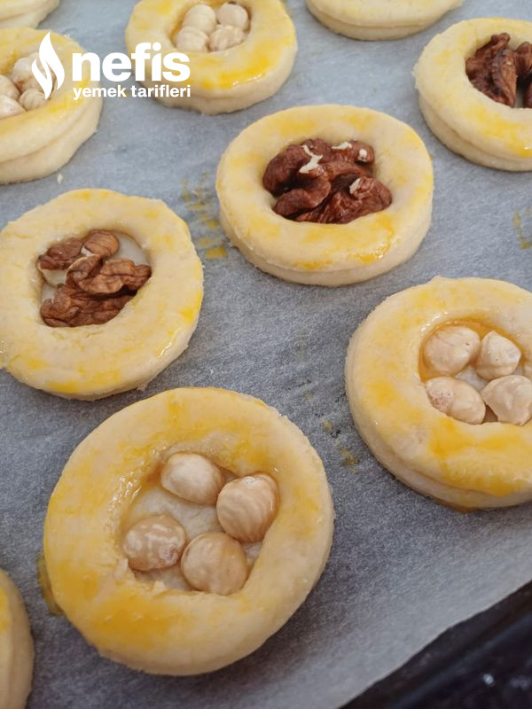 - Yuvarlak kesilen hamuru tepsiye dizelim. Üzerine yumurta beyazı sürüp, ortasını deldiğimiz hamurları yapıştıralım. Delik kısmını da fındık ve cevizle süsleyip üsteki kalan kısma da yumurta sarısı sürelim.