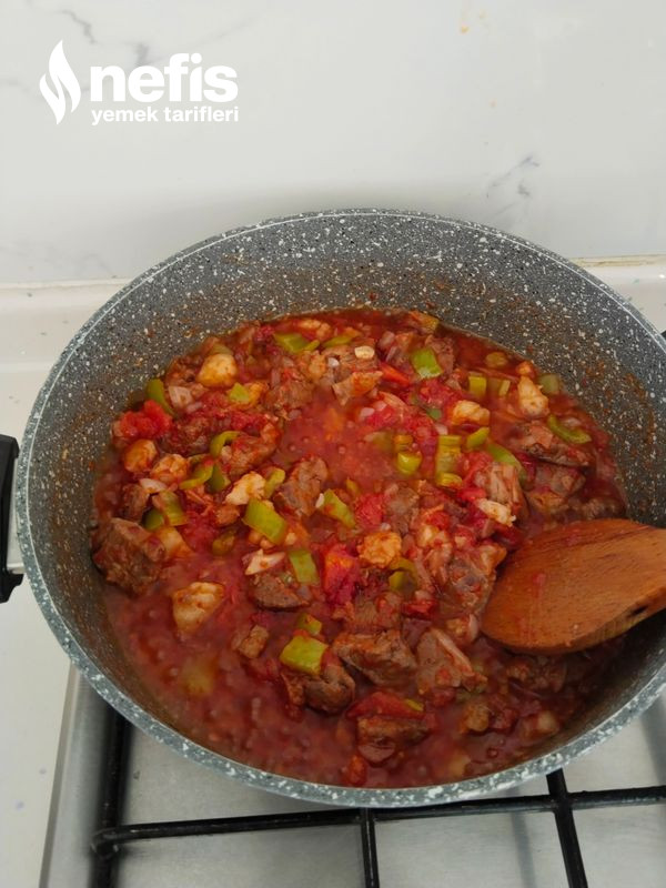 - Tuzunu ve karabiberini ekliyoruz akabinde et suyunu koyuyoruz (et suyunuz yoksa olağan sıcak su kullanabilirsiniz).