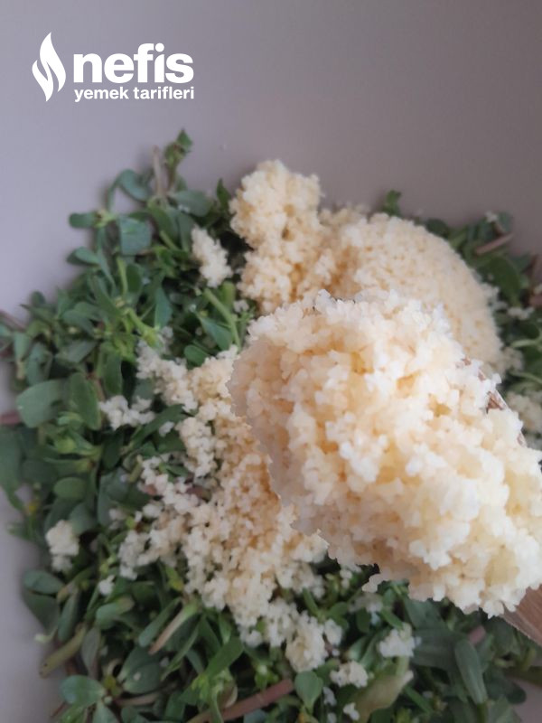 2. Şişen bulguru geniş bir kaba alıp üzerine, semizotu ,doğranmış köz biberi ,rendelenmiş sarımsağı ekleyelim üzerine ,sebze çesnisi serpelim yoğurdunu ekleyip karıştıralım.