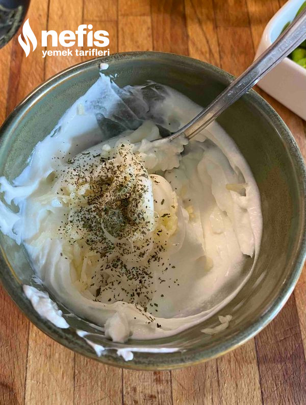 6. Yoğurt sosu için:süzme yoğurt,mayonez,sarımsak,tuz ve naneyi de karıştırıp bekletelim.