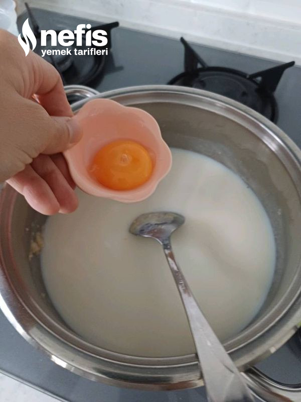 - Toz şeker ve yumurta sarısını ek edelim karıştırarak tekrardan ocağa alalım topaklanmaması için daima karıştıralım.