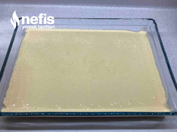 - Büyük uzunluk bir borcam ya da fırın tepsisini (yaklaşık 40×30 cm) yağlayın ve karışımı dökün.