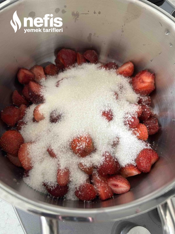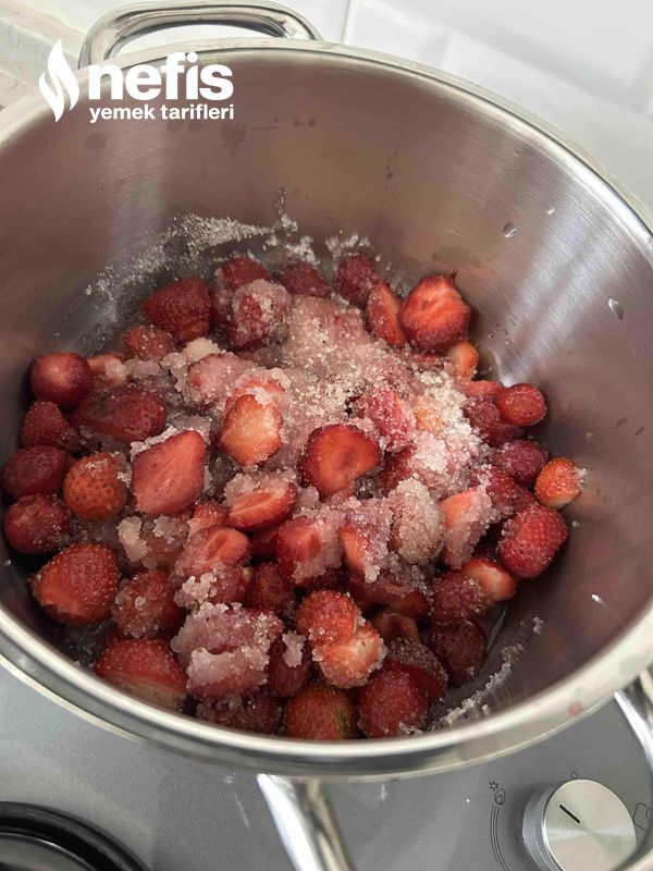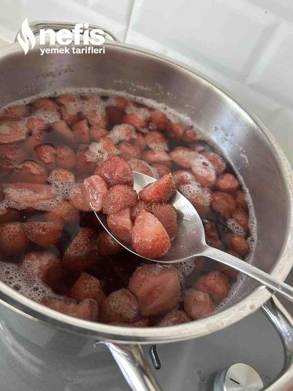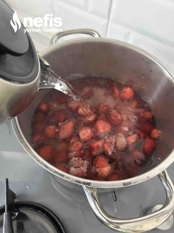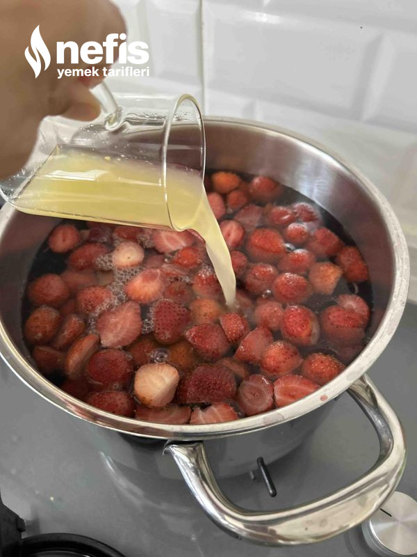 - Yarım saatin sonunda yavaşça sulanan çilekleri ocağa alalım 2,5 litre kadar su, bir adet limonun suyunu ek edelim ve kaynatmaya başlayalım.