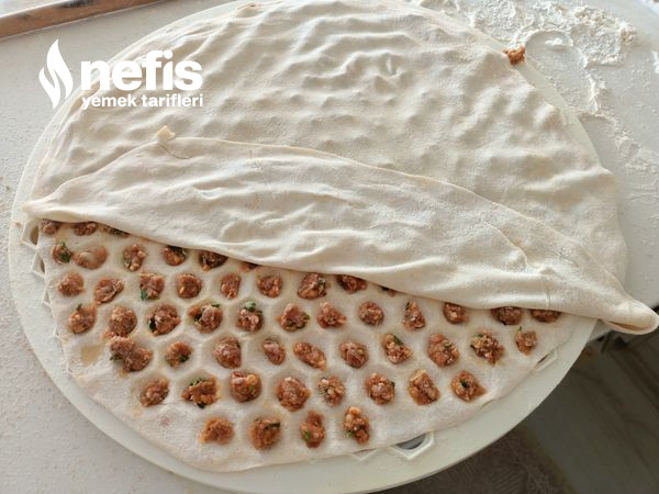 - Yufkanın hepsini tıpkı biçimde kıymaları eşit büyüklükte koyup bitirdikten sonra üzerine ikinci yufkayı koyalım.