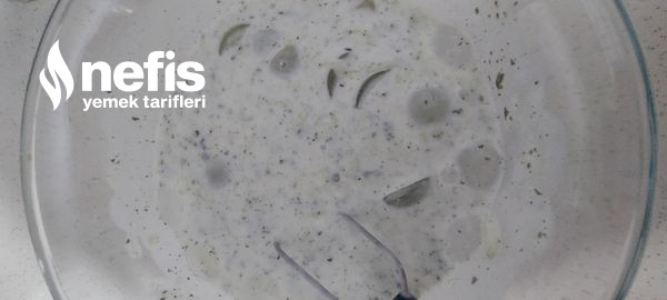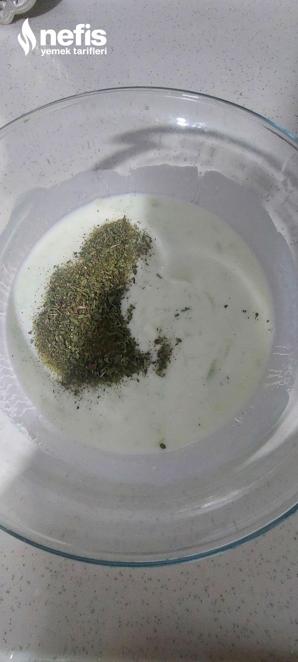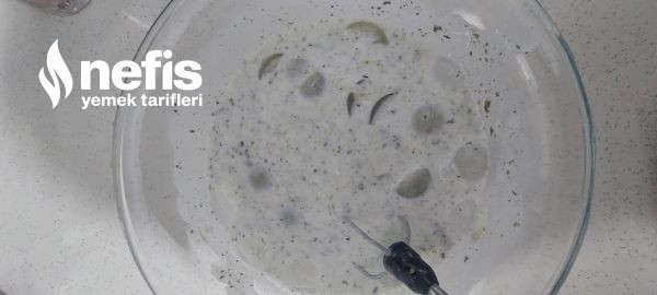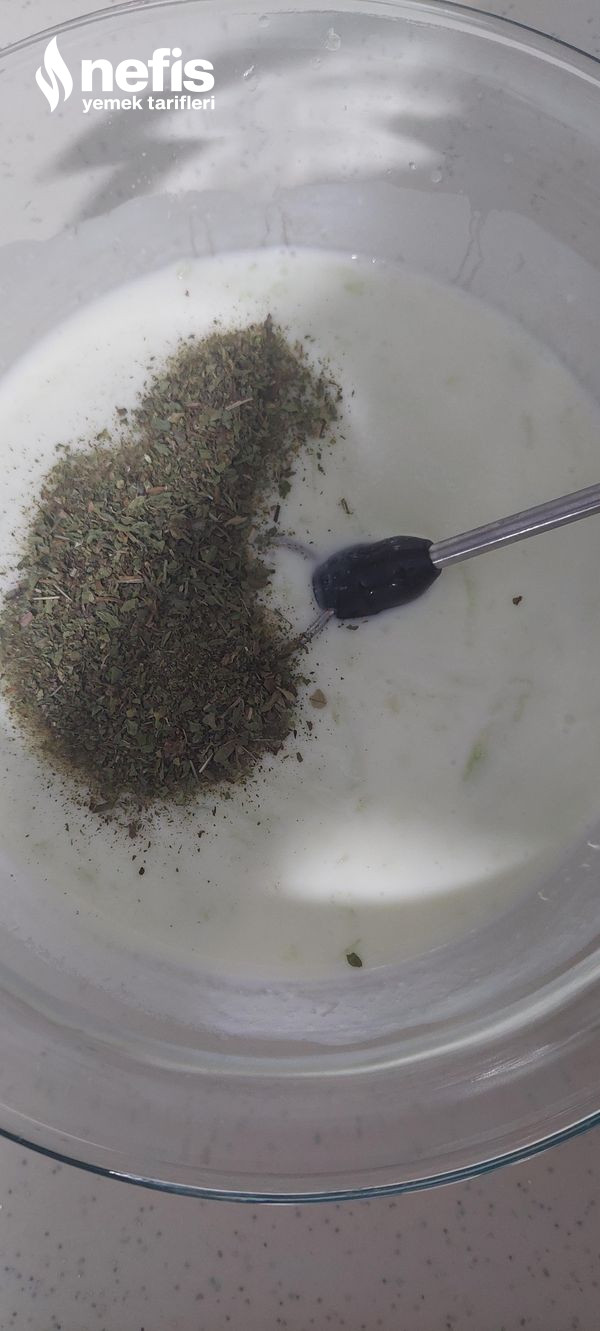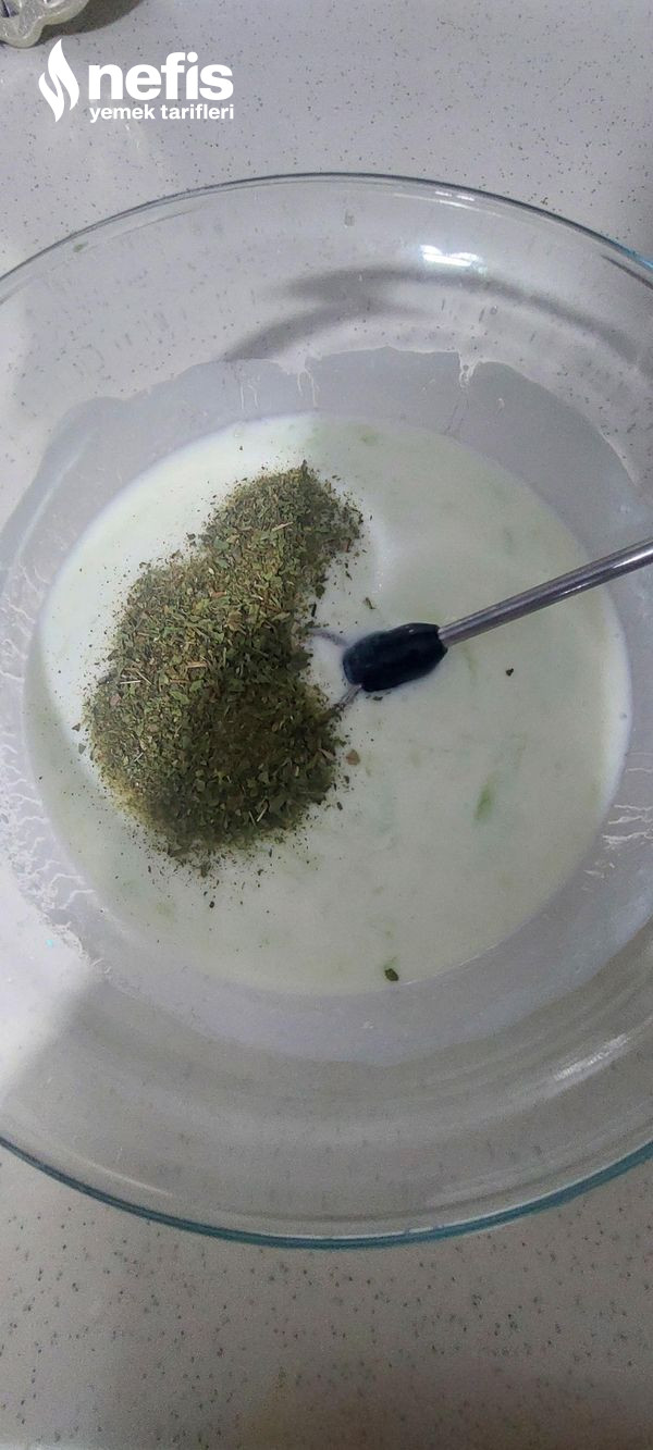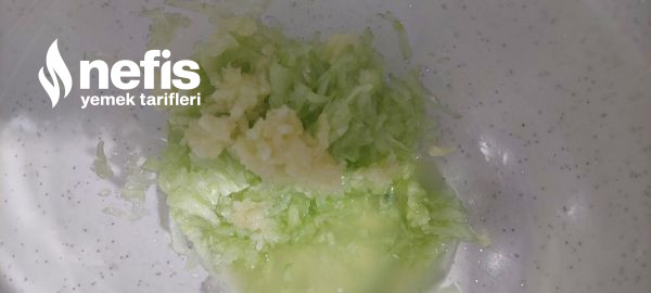- Öncelikle bir kaseye rendelenmiş salatalığımızı 2 diş sarımsağımızı ve kuru nanemizi alıp, karıştırıyoruz.
