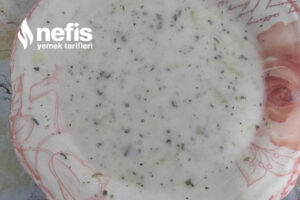 - Öncelikle bir kaseye rendelenmiş salatalığımızı 2 diş sarımsağımızı ve kuru nanemizi alıp, karıştırıyoruz.