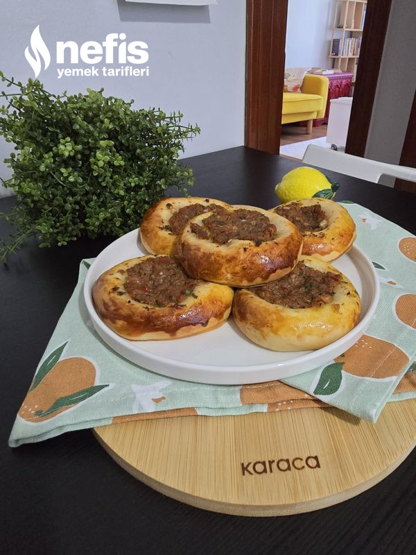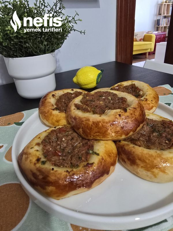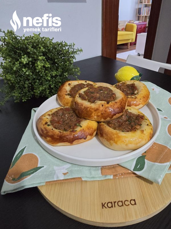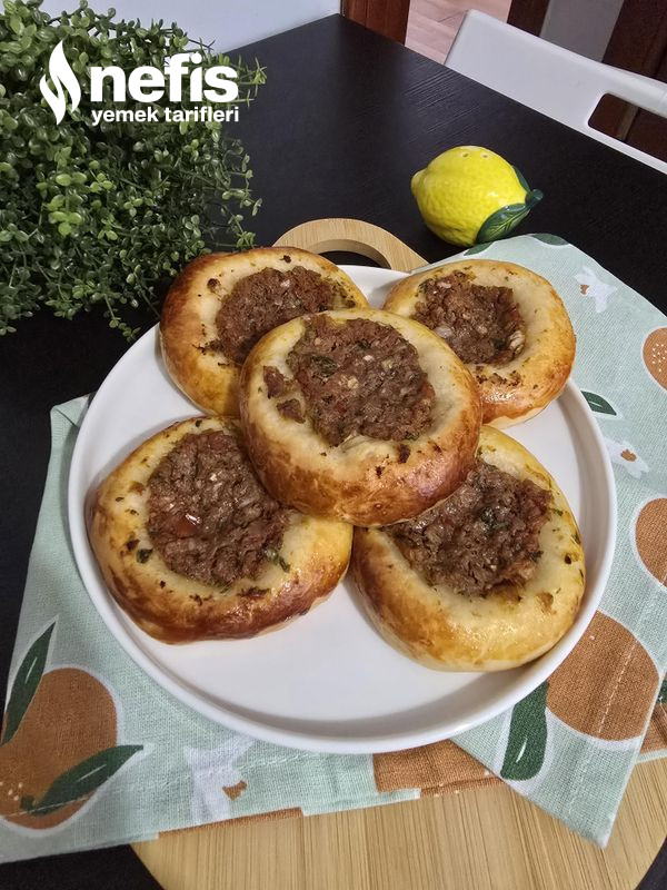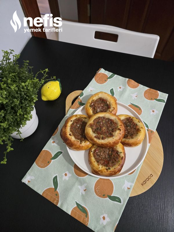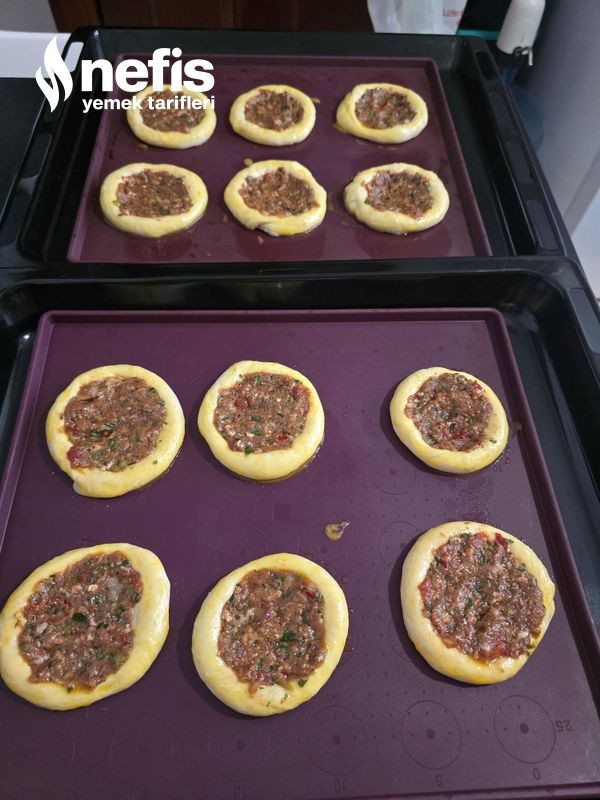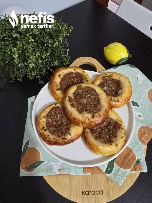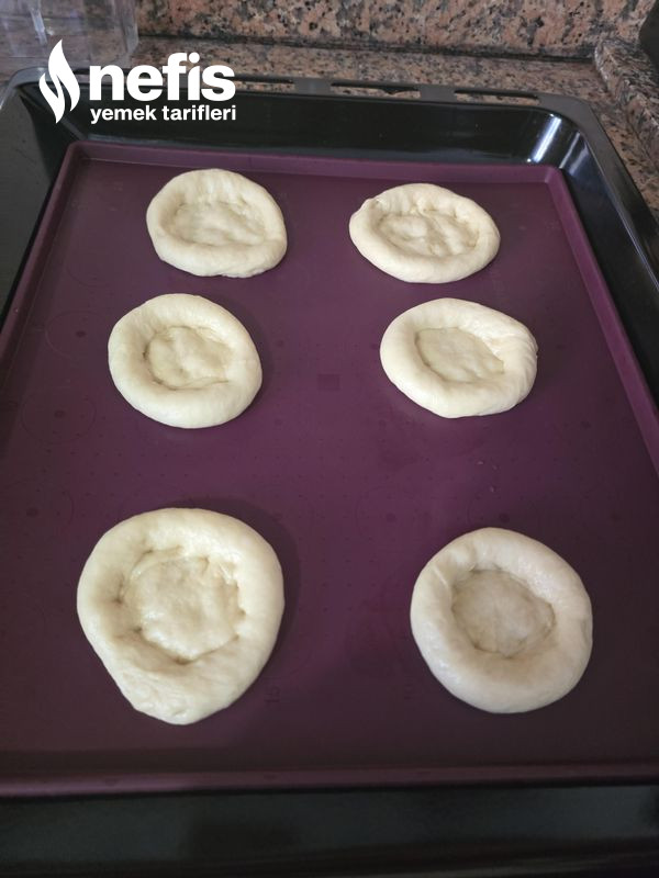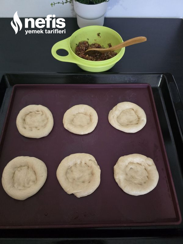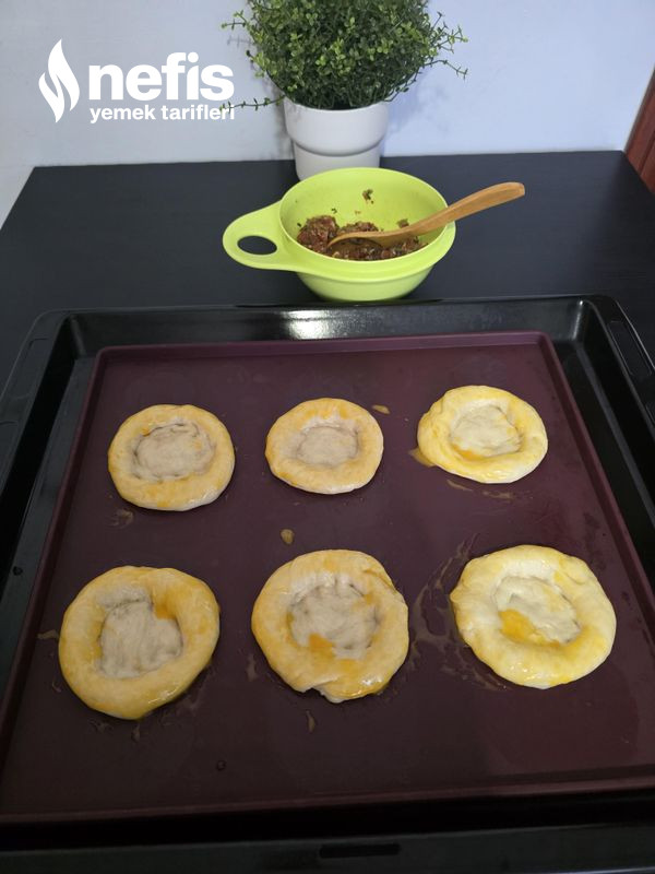 5. Ortasını parmağımızla bastırarak hal verelim, kenarına yumurta sarısı sürüp kıymalı harcı ortasına koyalım.