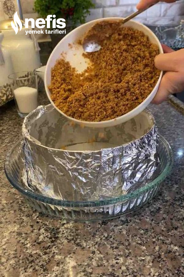 - İlk olarak tabanımızı yapalım. Rondodan çektiğimiz bisküvilerle erittiğimiz tereyağını karıştıralım.