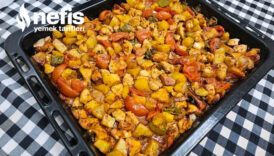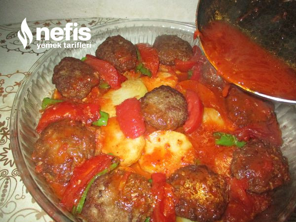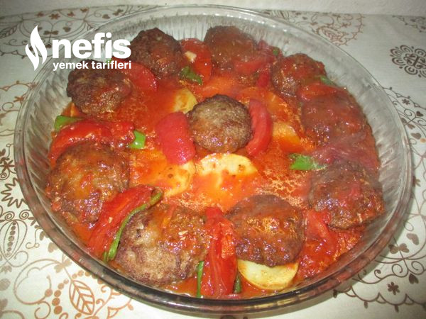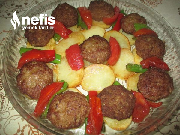 - Tepsiye patatesleri dizelim üzerine köfteleri koyalım ortalarına domates biber dizelim tepsi için olan sosu gezdirerek dökelim üzerine ıslatılmış yağlı kağıt ile kapatalım. 180 derecede 15 dk pişirelim.