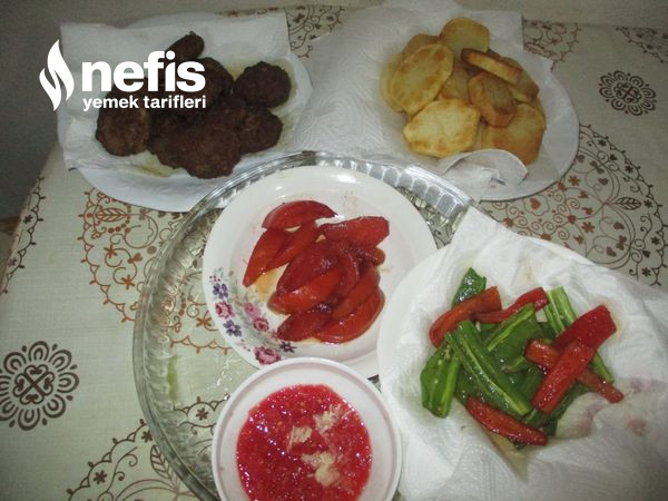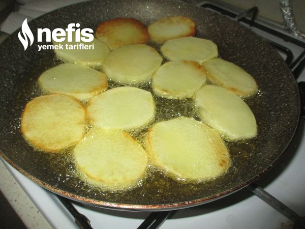 - Patatesi soyalım bir cm kalınlığında halka keselim. İki tarafı çok az kızartalım. Havlu kağıt serilmiş tabağa alalım domatesi de elma dilim kesip çok az yağda kızartıp, havlu kağıt tabağa alalım.
