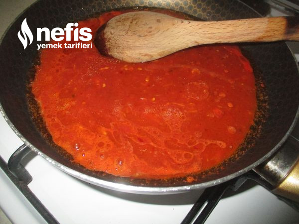 - Ekmekler için olan sosu da tavaya yağları koyalım. Rendelenmiş domates, sarımsak koyalım bir dk kavuralım. Sonra suyunu dökelim 6-7 dk kısık ateşte sos fokurdasın tuz ,baharat serpelim karıştıralım kapatalım.