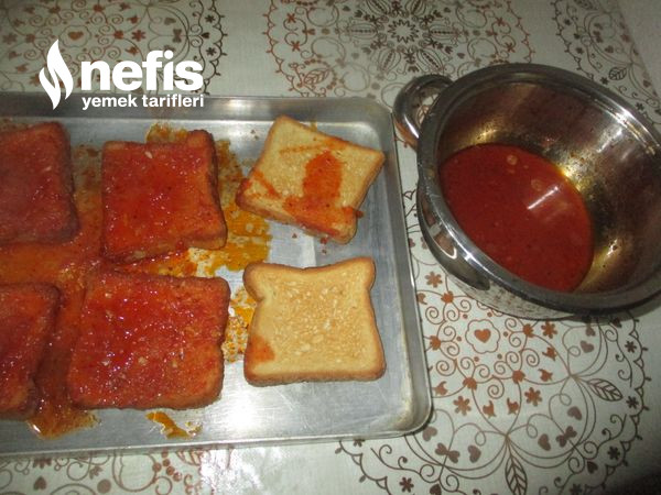 - Tost ekmeği yağlı kağıt serilmiş tepsiye dizelim, iki tarafını çok az kızartalım, ekmekleri bir tabağa alalım. Soğumaya bırakalım.