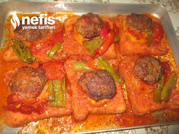 - Başka bir fırın tepsisine tost ekmekleri dizelim birer kepçe sostan gezdirerek dökelim köfteleri üzerine koyalım. Domates, biberleri üzerine koyalım.