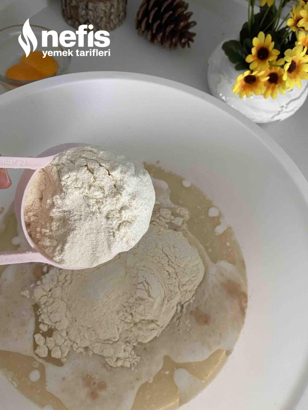 - Öncelikle un hariç bütün materyalleri yoğurma kabına alıp karıştıralım 10 dakika bekletelim.