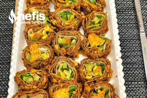 5. Rulo yapıp saralım. Dışına biraz nar ekşisi sürdükten sonra ezdiğimiz cips modüllerinin üzerinde gezdirerek baş parmağımızın kalınlığında keselim servise hazır.