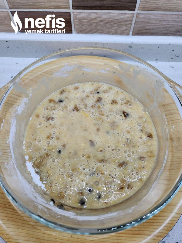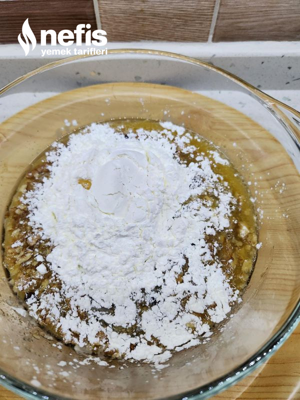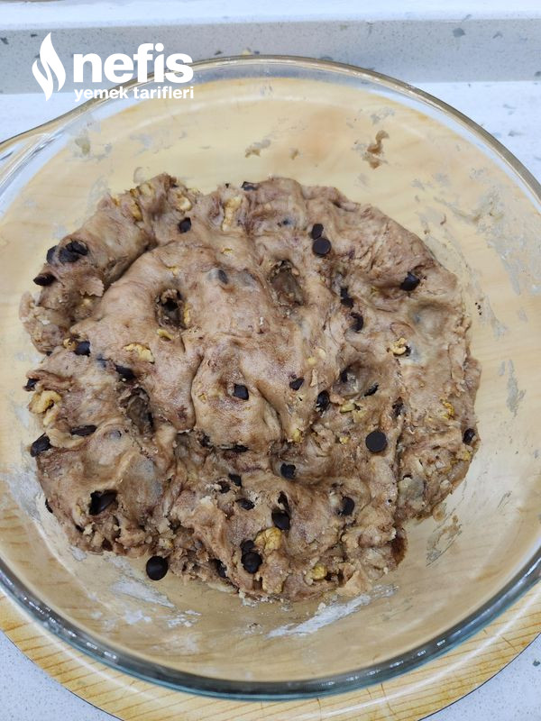 2. Nişasta, damla çikolata ve ceviz de ek edilerek biraz daha karıştırılır.
