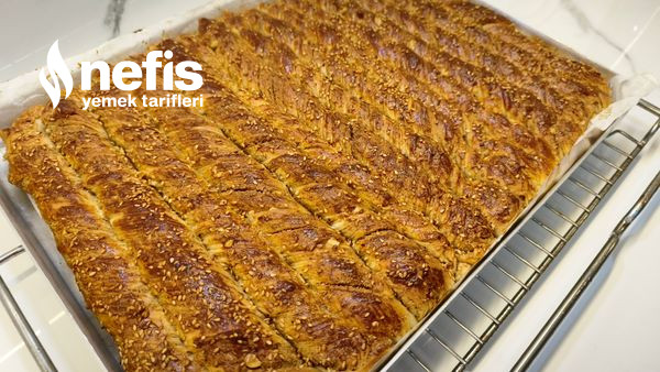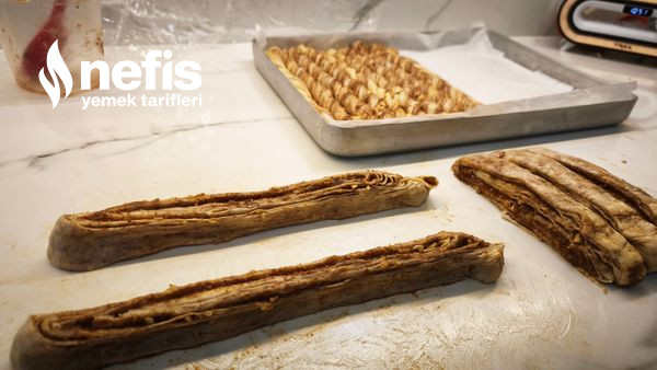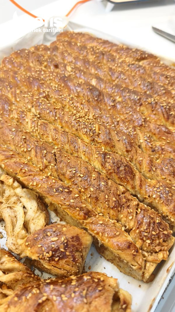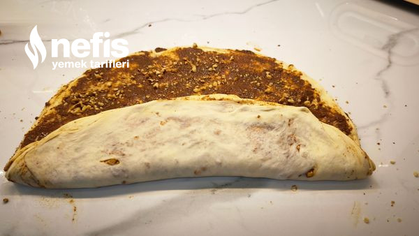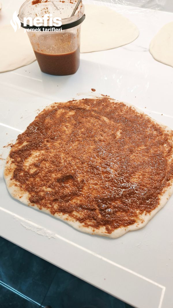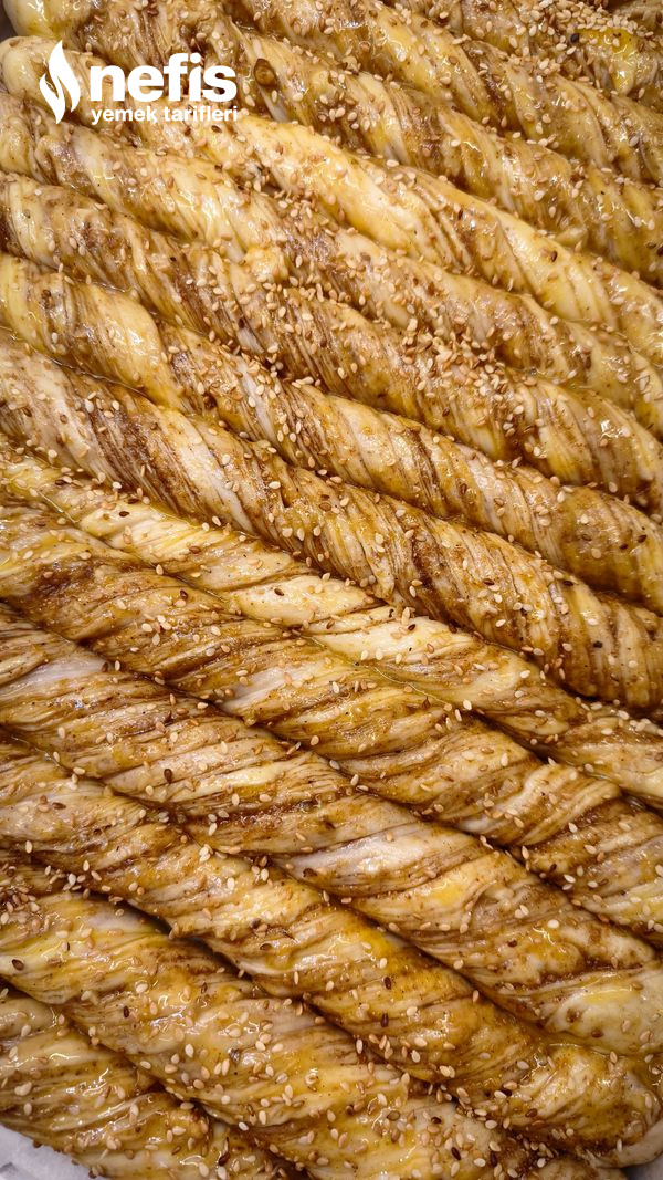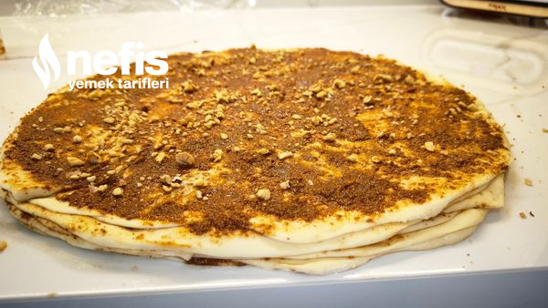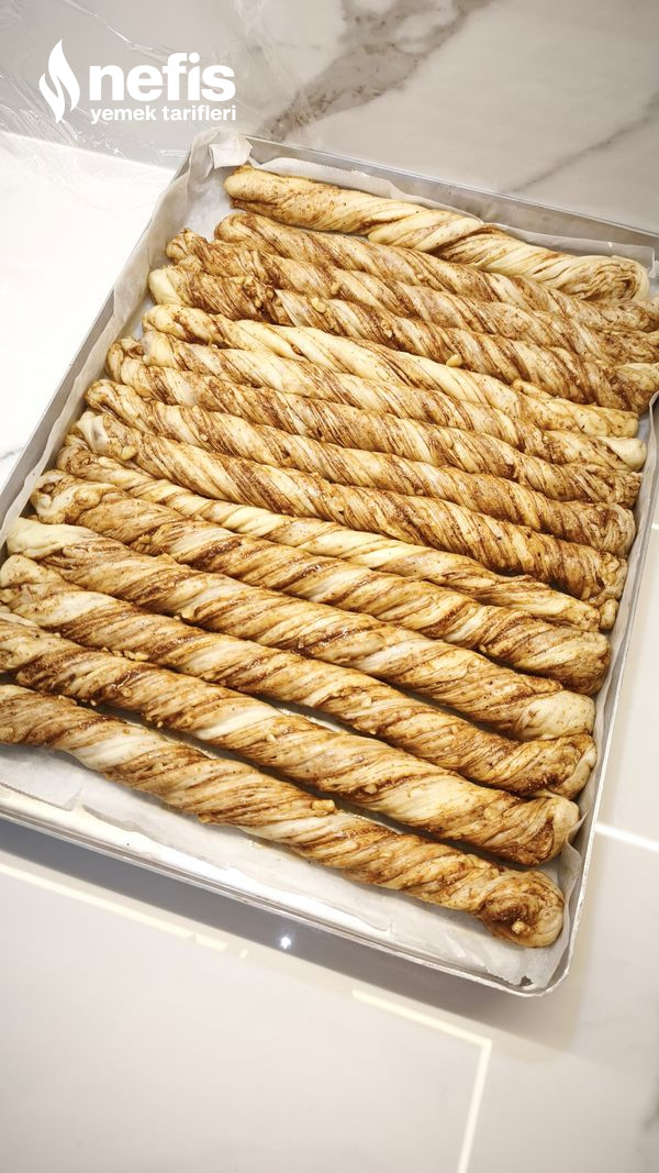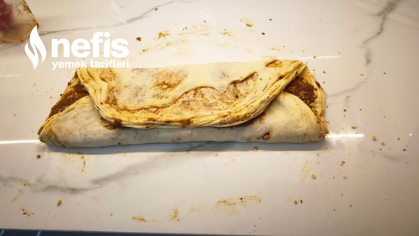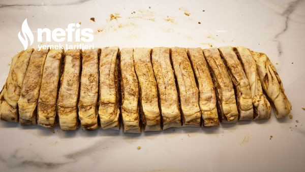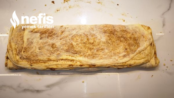 4. Genişlettiğiniz hamuru kenarlardan ortaya yanlışsız katlayın ve ince dilimler halinde keserek burgu yapın. Tepsiye dizerek 20 dkka tepside mayalanmasını sağlayın.