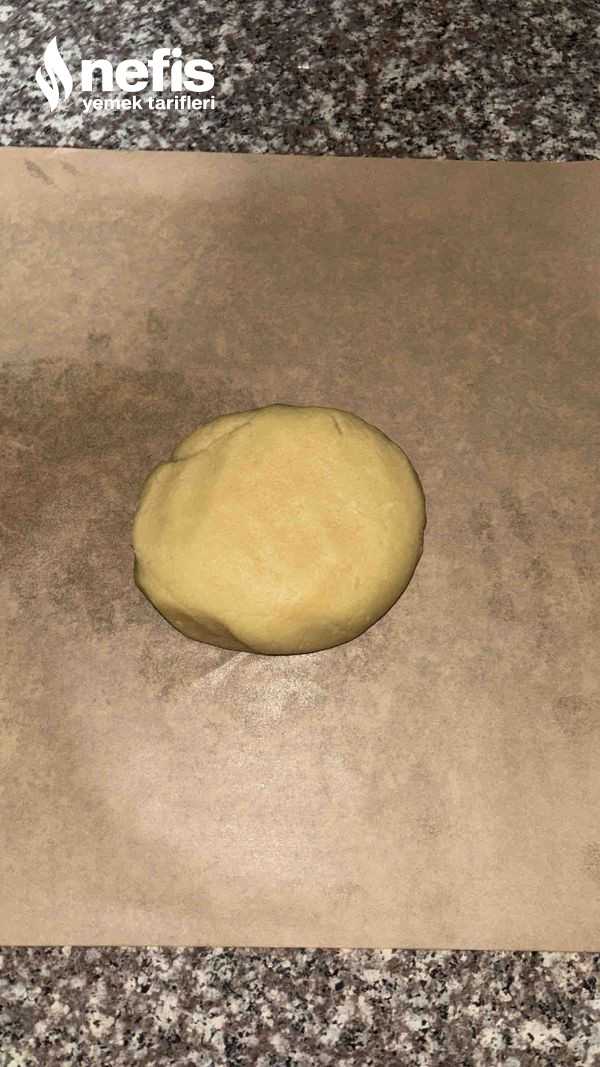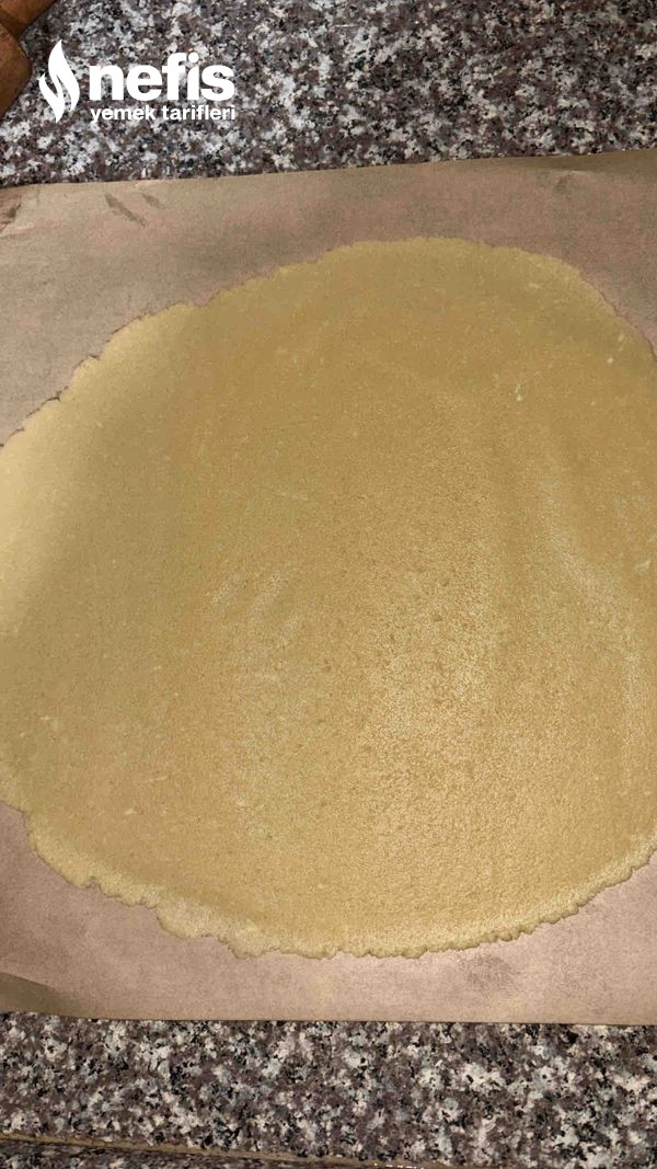7. Yağlı kâğıt serelim üstüne ikiye böldüğümüz hamurun 1 bezesini alalım üstüne tekrar bir yaglı kâğıt serelim ve merdane yardımı ile açalım.