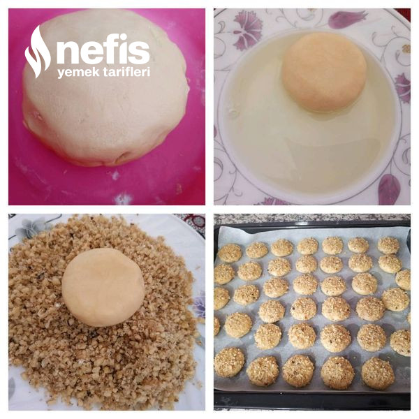 3. Hazır olan hamurumuzdan ceviz büyüklüğünde koparıp elimizde yuvarlayıp hafif bastırıp evvel yumurta akına daha sonra cevize batırıp tepsimize dizelim.