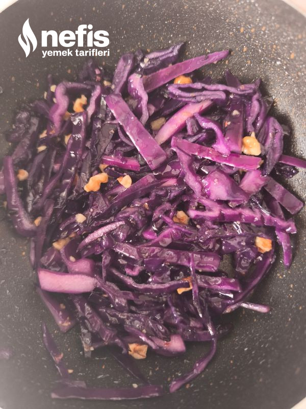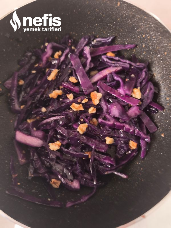 1. Mor lahanayı ince ince keselim. Tavaya yağı koyalım üzerine lahanayı ekleyelim. Üzerine tuzunu serpelim. Diriliğini kaybedene kadar karıştıralım. Piştikten sonra cevizleri koyup bir dakika daha karıştırıp, altını kapatalım. Soğuması için bir kenara koyalım.