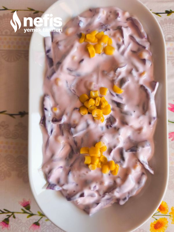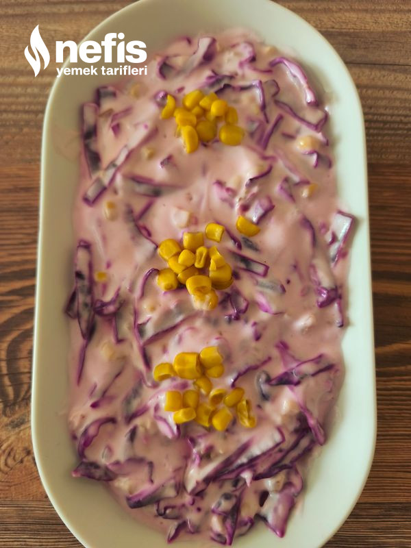 3. Mısırı ve mor lahanayı bu karışıma ekleyelim. Servis tabağına koyabilirsiniz. Dolapta bekletiniz vakit rengi daha da mor olacaktır. Afiyet olsun.