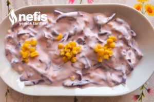 3. Mısırı ve mor lahanayı bu karışıma ekleyelim. Servis tabağına koyabilirsiniz. Dolapta bekletiniz vakit rengi daha da mor olacaktır. Afiyet olsun.