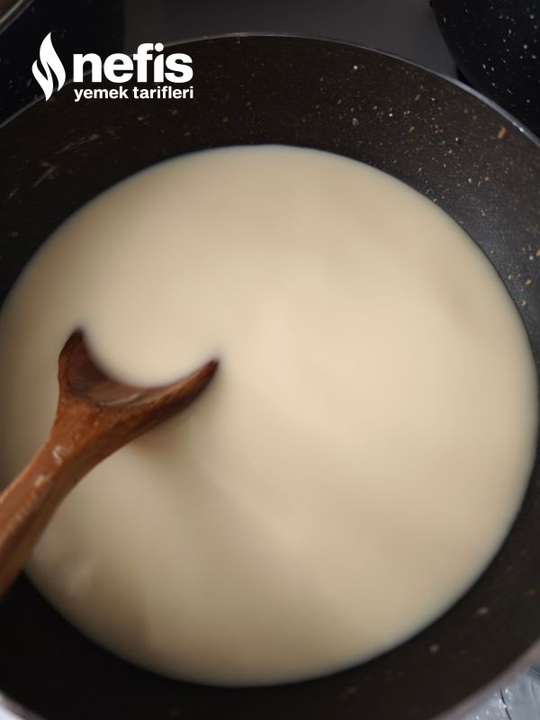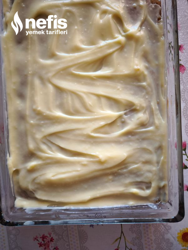 7. Bir paket pastacı kreması ile 2 su bardağı sütü ocakta kaynatıp tatlımızın üzerine dökelim.