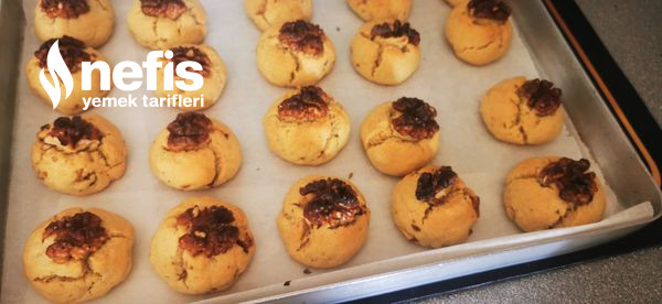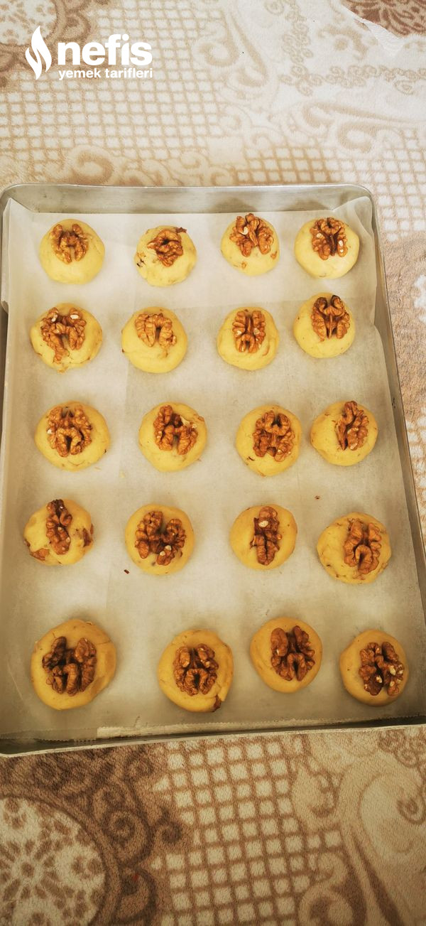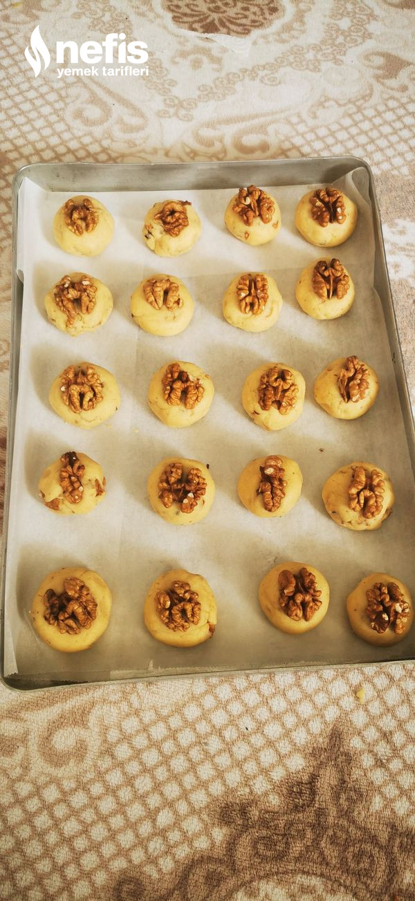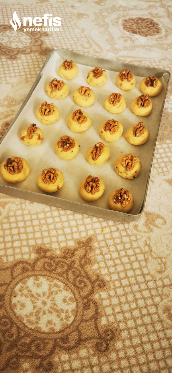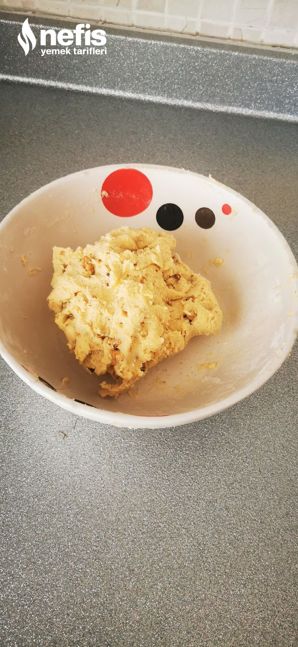 - Malzemeler uygunca karışınca son olarak cevizi ekleyip, güzelce homojen kıvama getirip, ceviz büyüklüğünde yuvarlanıp fırın tepsimize alalım.