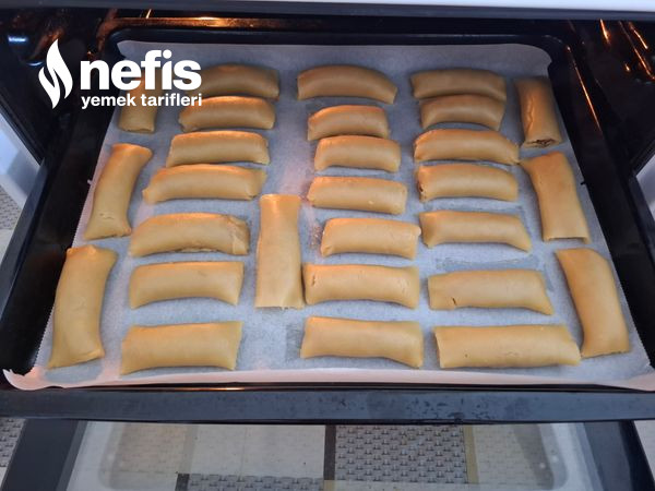 - Kenarlarının düzgün olması için bıçakla incecik kesin yağlı kağıt serili tepsiye dizin.